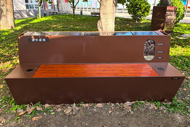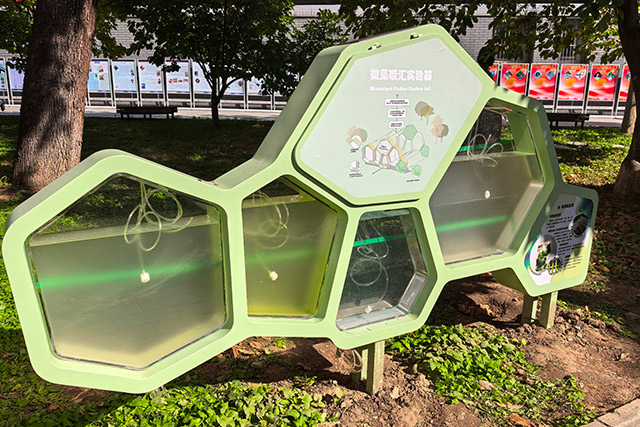 新落成的花园处处有巧思。“德馨花圃”摒弃了常规的观赏花卉,而是选用多年生本地植物,并通过乔、灌、草的合理搭配,形成了一个稳定的微生态系统。设计团队介绍,这不仅保证了花圃四季有景,也显著提升了花园的碳汇能力,让它成为一块会呼吸的“绿肺”。“雨水花园”内,溢水口、地下储水桶与渗水管道共同构成了一套高效的雨水收集系统;雨水经沉淀过滤后,可用于浇灌绿地,为鸟类补给饮水。同样能储水的还有“太阳能储水座椅”:椅面缝隙收集的雨水经过滤储存后可用于灌溉;顶部的太阳能板则可将太阳能转化为电能,为手机等设备提供无线充电。学生们还创新打造了“微藻农场”,利用微藻光合作用效率高的特性,净化校园空气。