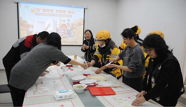 “开包了!”随着工作人员的一声吆喝,活动重头戏包饺子开始。大家纷纷动手,有的擀皮、有的包馅,一边唠家常,一边包饺子,“一边转皮一边擀”“你那个两边捏紧点”……不一会儿的工夫,一个个饺子新鲜出炉,骑手们品尝着自己亲手制作的热气腾腾的饺子,脸上露出了灿烂的微笑。“平时每天忙,今天一起动手包饺子,也挺有仪式感的。”外卖骑手王师傅说。