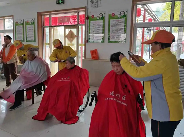 通州区公共文明引导员来到梨园敬老院,用他们娴熟的理发技术,让老人们清爽舒适地过节。他们一边与老人聊着家常,一边耐心细致地为老人修剪发型,理到鬓角处,会轻轻护住老人耳廓。面对卧床多年的老人,两名引导员默契配合,一人托扶、一人修剪。
