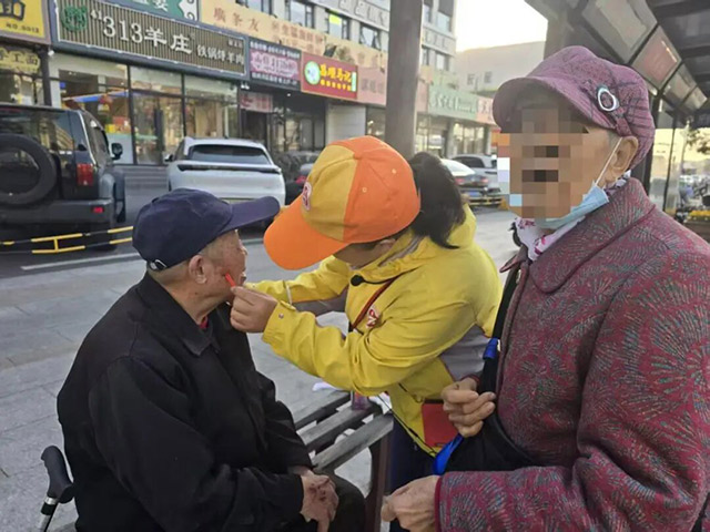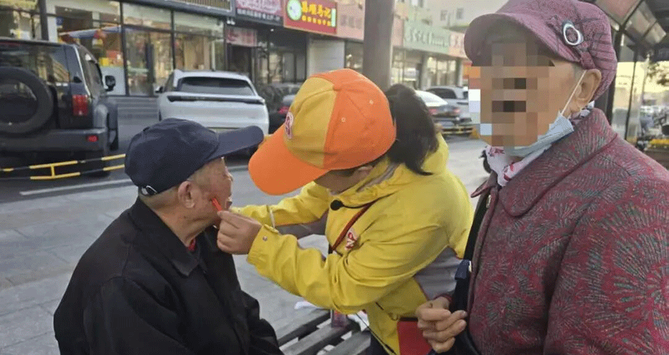 “您别急,我这有碘伏。”陈建春在安抚老人的同时,用随身携带的湿纸巾先为老人清理伤口旁的尘土与血迹。随后,王新使用碘伏为老人的伤口消毒,并贴上创可贴,以防感染。