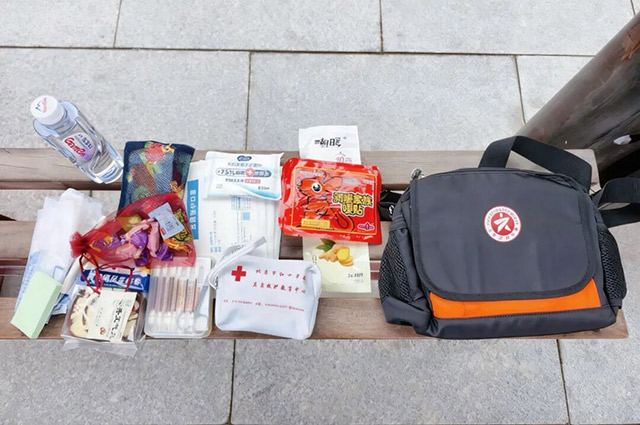 引导员随身携带的应急物品远不止于此。糖块儿、针线、一次性雨衣、速效救心丸……是队员们服务背包的常备品。这个随身的小背包也被市民称为“百宝箱”。引导员们还会定期检查补充“百宝箱”中的物品,确保这些“宝贝”在关键时刻能够派上用场。