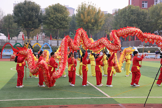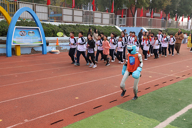 在特色体育活动展示环节,新农村小学还展示了武术、空竹、舞龙等项目。该校还创新引入人工智能元素,智能机器人和学生一起展示拳击,陪伴学生跑步,激发学生的锻炼热情。