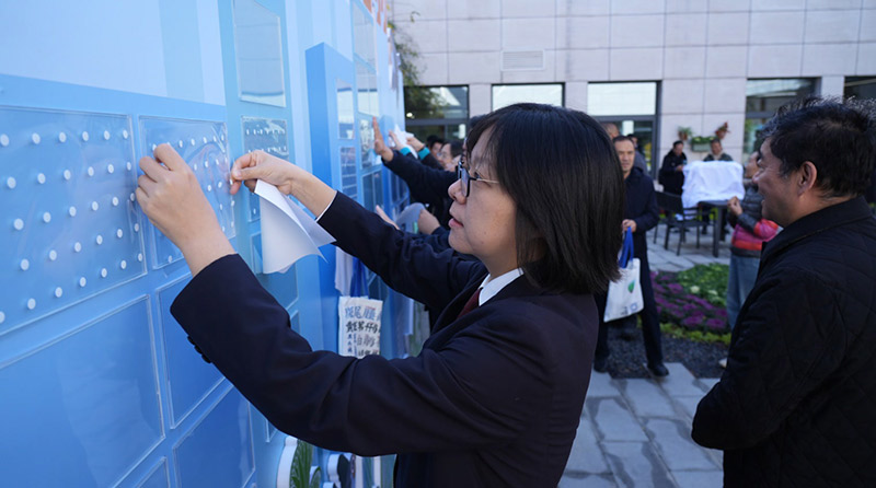 观众将防鸟撞贴纸粘贴在防鸟撞互动装置上。