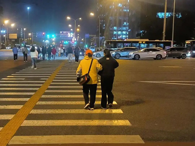 同日晚高峰,石景山区古城路口西北角,一位女士因腿伤发作、头晕难行。引导员周俊敏看到这位女士不太舒服,主动上前搀扶,协助其安全通过路口,并一直陪伴在侧,直至女士家人赶到,将其接走。