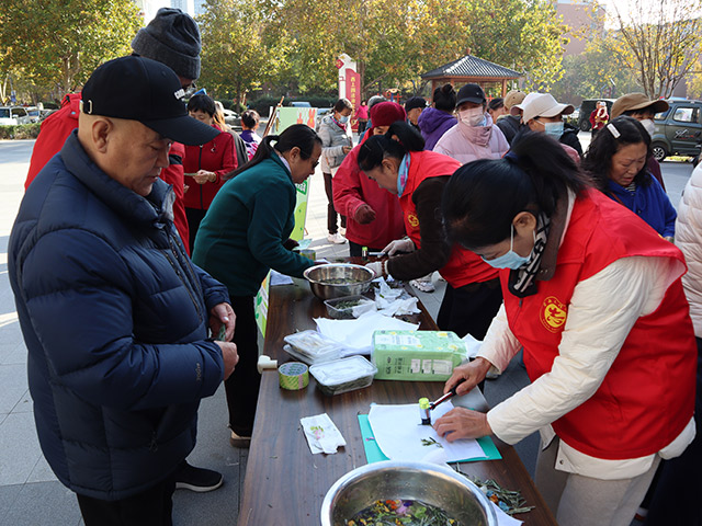 最为热闹的是“花影拓香留”项目,每位参加活动的居民都会发放一块拓染方巾,选择两片树叶和两片花朵进行拓印。只见大家举着小锤子,将植物轻轻定格在方巾上,互相展示自己的作品。“今天来参加活动,既宣传了《居民公约》,更学到了不少环保知识,真是一举多得!”一位居民高兴地说。
