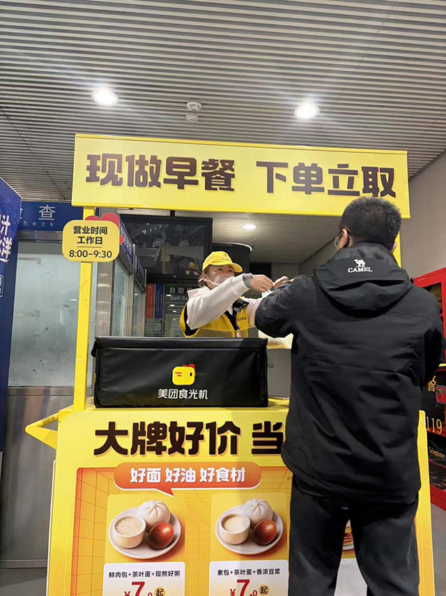 在地铁10号线金台夕照站C口旁,每天清晨7点半,“美团食光机”早餐车摊位总会准时开启服务。工作人员推着保温箱,满载着热乎乎的早点来到车站,烧饼夹肉、豆浆、粥等早点一应俱全。“价格便宜,花几块钱就能吃饱,拿到手还挺热乎的。而且买早餐不用绕路,太方便了!”上班族张女士说。
