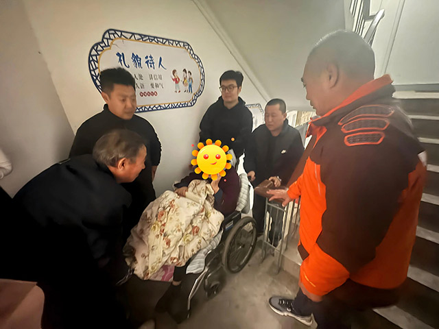 “来,一二三,起!”“慢点,慢点,这边拐弯!”几人小心翼翼地向上挪动,默契配合,尽量保持轮椅的平稳,避免给老人带来不必要的颠簸。爬上五楼,他们中途多次停下休息,汗水浸湿了他们的后背。最终,陈女士被平安、稳妥地护送到了家中。