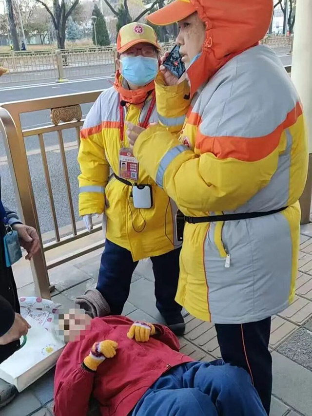 在救护车到来前,两名引导员始终守护在老人身边。注意到老人紧张得双手发抖,她们轻拍其手背安慰:“别担心,救护车马上就到。”不时询问老人身体状况,耐心缓解老人焦虑。