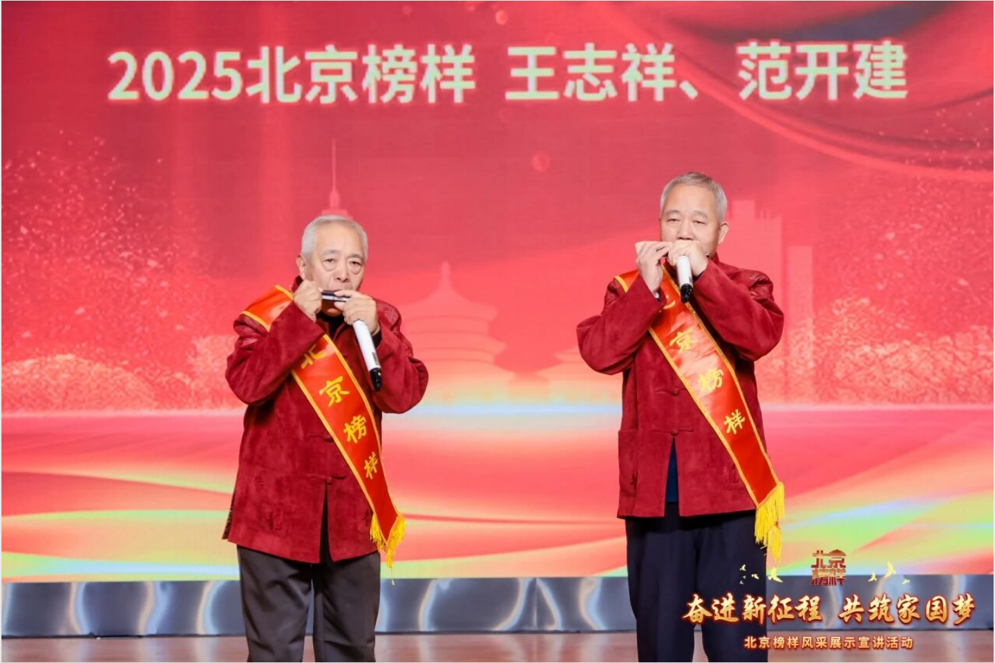 “2025北京榜样”王志祥和范开建这对携手走过18年的黄金搭档,为在场的师生代表,讲述了他们以口琴为媒,热心公益、乐于助人的暖心故事。一曲《打虎上山》响起,活泼轻快的节奏瞬间点燃全场氛围,孩子们跟着旋律轻轻哼唱,掌声与琴声交织成最动人的校园乐章。