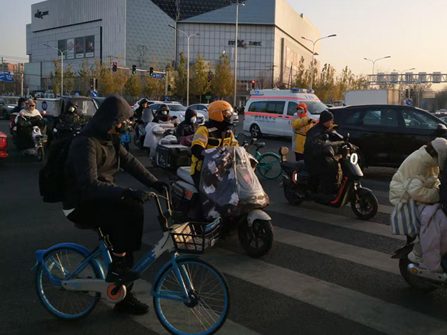 在附近值守的另一名引导员蔡如娣听到动静,也赶来支援。眼看路口车来车往,极易发生二次事故,蔡如娣从路旁搬来一辆共享单车,放到事故车辆后方七八米处,提醒车辆注意避让。不到三分钟,两人便有条不紊地完成了现场应急处置。