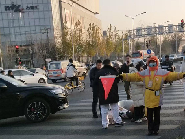 正在路口服务的海淀区公共文明引导员郭秀玲赶紧向事故点跑去。她发现孩子面部有擦伤,鼻子流血,手和衣服沾着大量血迹且腿部无法活动,孩子母亲也腿部受伤,难以站立。“孩子别怕,阿姨先帮你止血。”郭秀玲掏出纸巾为孩子清理面部并按住鼻子止血,同时拨打120急救电话。