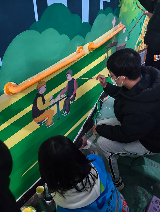 前期,通过邻里座谈会、线上征集,广泛倾听民意,社区选定了两个楼门作为试点。物业率先完成墙面刷白,提供翻新所需的滚筒、刷子等工具,为后续创作备好平整干净的“画布”。随后,社区里的书法、绘画爱好者捐出原创作品,由老中青少四代居民组成的“彩绘小队”热情参与,将书法、彩绘搬上墙面。
