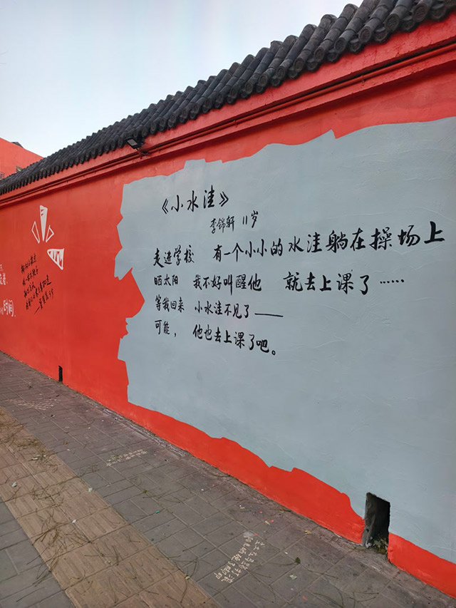 在这条街巷上,共采用了诗歌、句子近千首(句),其中大多数来自孩子们——北京十一学校丰台小学的孩子们。