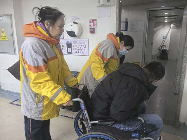 到达医院后,因男子行走困难,引导员租来轮椅:“坐这个,我们去急诊能快些。”看他独自一人又疼痛难忍,引导员们又安慰道:“别担心,检查和缴费我们都会陪着。你就当我们是家里人。”