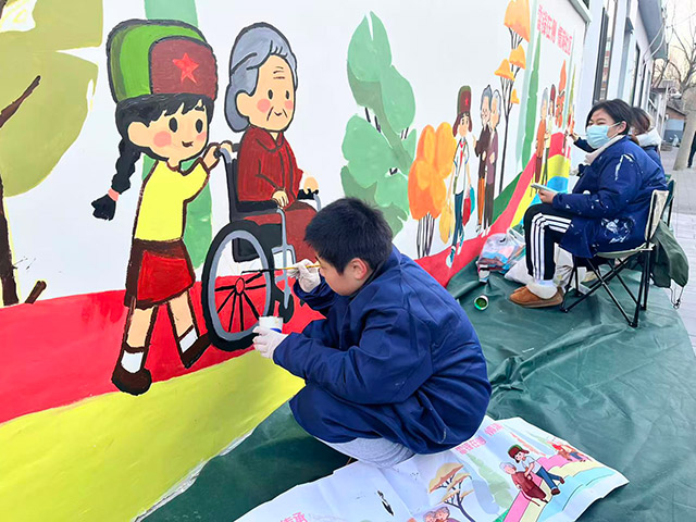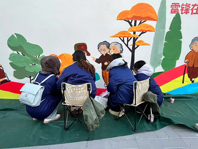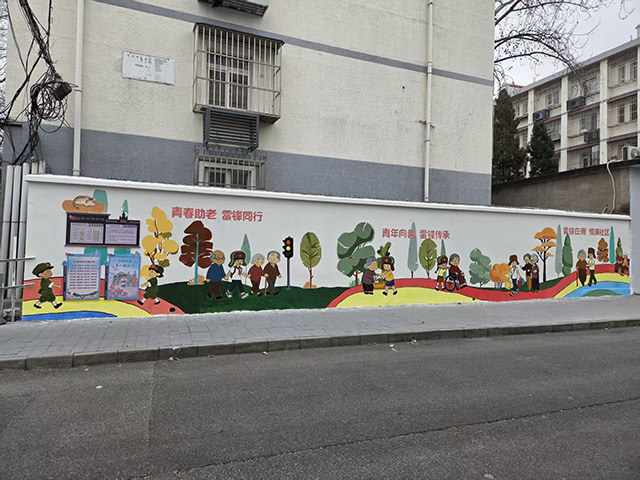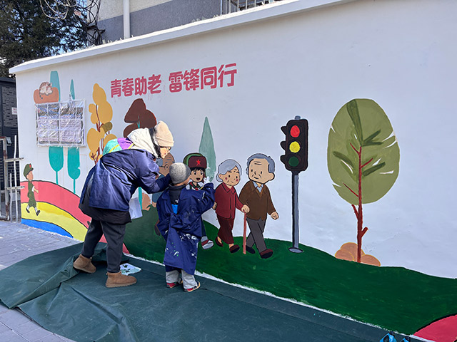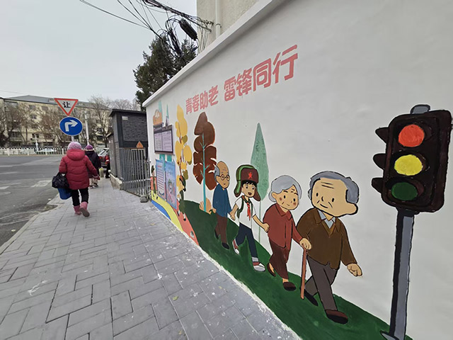 在月坛北街25号院北门入口处,一幅以弘扬雷锋精神和敬老助老为主题的墙绘,把冬日街道点缀得温馨起来。画面里戴着雷锋帽的小朋友正帮老人推轮椅、提重物,不少路人的目光都被这幅墙绘吸引,忍不住夸赞两句。这面墙绘由展览路街道阜外西社区联合北京建筑大学责任规划师团队、建筑学院团委研会团队、规划和园林第二党支部的84位同学共同完成,用时近两周。