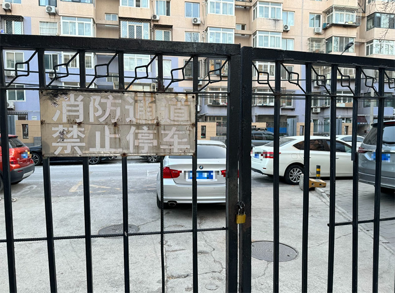 双桥六号井小区北区南侧的消防通道出入口前停了多辆私家车。
