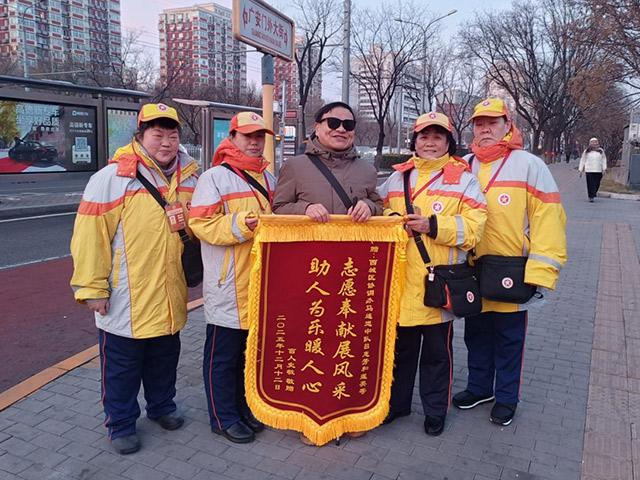 12月15日早上7点左右,在广安门外甘石桥西行站台,盲人乘客史先生将一面写有“志愿奉献展风采 助人为乐暖人心”的锦旗,送到了西城区公共文明引导员吕惠芳、和莲英、周琪、赵燕北四位引导员的手中。