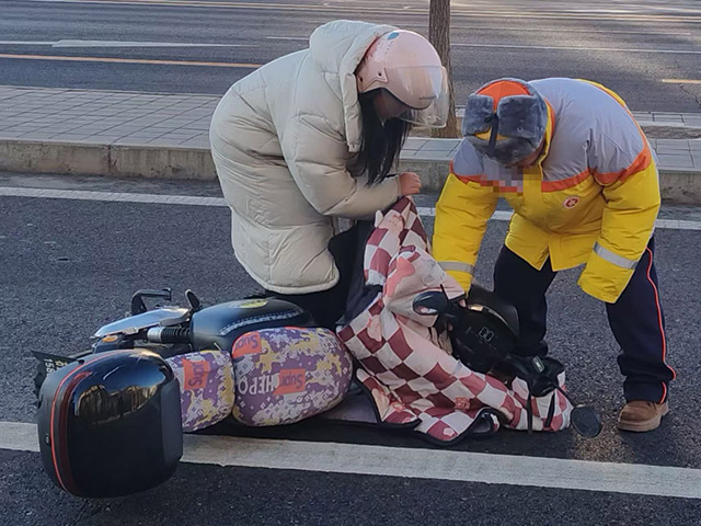 在石景山区北辛安公交站附近,一位骑电动车的女士不慎摔倒,车身压住了腿。附近的引导员迅速上前,扶起电动车,将女士搀扶起来,并引导后方车辆有序通过。