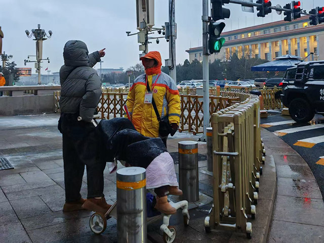 在西城区南长街南口,一位推着婴儿车的女士正对着手机地图焦急地查看路线。引导员主动上前,为这位妈妈指了一条最便捷、安全的路,让她和宝宝少走冤枉路。