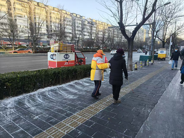 顺义、延庆等区的引导员们手持扫帚、铁锹,重点清扫路口斑马线、人行道上的积雪,并提醒过往行人“小心路滑”“注意安全”。