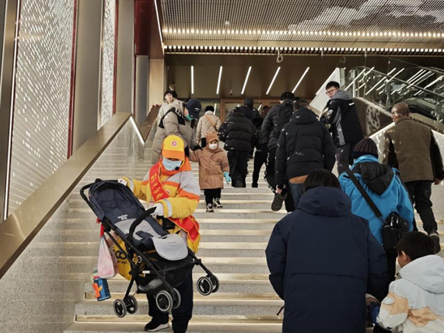 在花庄地铁站D出口,一位年轻妈妈正一手抱着孩子,一手提着婴儿车,艰难地走下台阶。引导员李志平看见后,立刻快步上前:“我来帮你!”随后稳稳接过婴儿车护送其出站。这位妈妈连声道谢:“带孩子出门不容易,有您在真是太暖心了!”