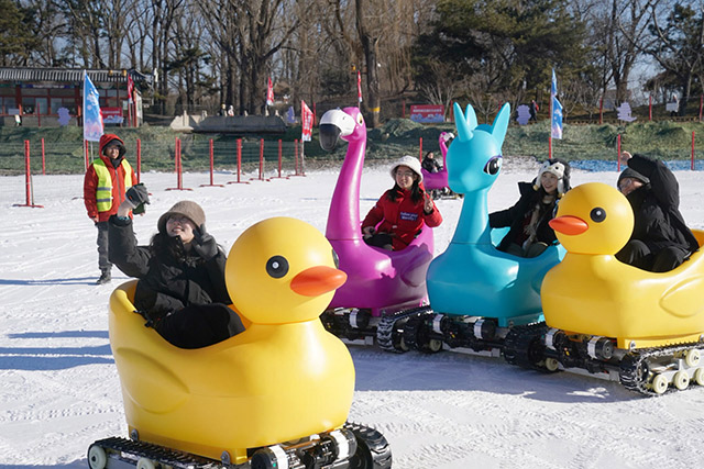 除了单人冰车、双人冰车、冰上自行车等备受喜爱的传统项目外,园区还保留并升级了冰鞋租赁服务,特别为零基础的新手配备了“小海豚”滑冰助手,助力初学者轻松解锁冰上乐趣;同时,支持游客自带冰鞋购票入场,让资深冰上爱好者得以尽情挥洒,感受风驰电掣的冰雪激情。而凤麟洲冰场则聚焦亲子互动,经典的冰车、冰上自行车项目之余,人气爆棚的电动狗拉雪橇依旧温情上线,家长与孩子携手驰骋冰面,欢呼声、笑声交织在一起,定格温馨的亲子时光。