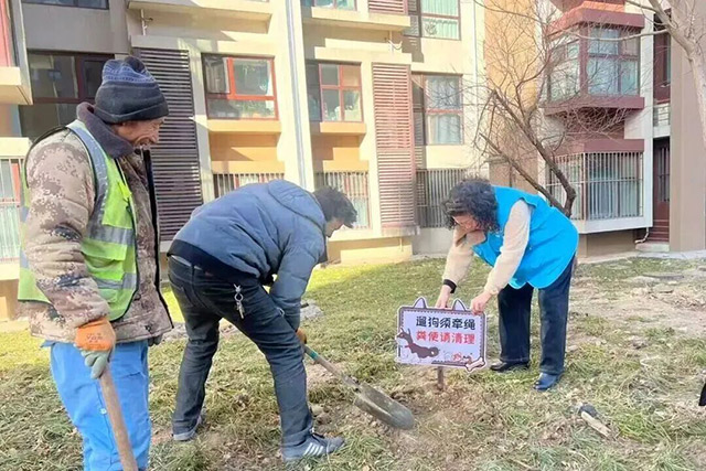 为规范养犬行为,营造和谐邻里氛围,金盏嘉园第三社区开展文明养犬主题活动。工作人员与居民志愿者一同清理公共区域内的宠物粪便,清洁步道、绿化带等公共空间;同时在醒目位置张贴文明养犬宣传标语,引导居民自觉规范养犬行为,共同维护清洁、安全的社区环境,推动邻里文明和谐。