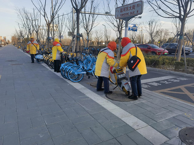 同一天下午,通州区某路口停满了乱放的共享单车和电动车,人行道被挤占,路都不好走了。即将上岗服务的引导员看到后,马上行动起来。有的把倒地的车扶起来,有的两人一组,合力将占道的电动车挪到指定停放区并摆放好。不一会,路口就恢复了整洁与畅通。