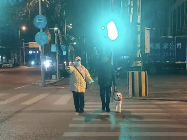 1月8日清晨,在丰台区的一个路口,一位盲人朋友牵着导盲犬,在斑马线前有些迟疑。引导员金小莉看到后,立刻上前询问:“您好,需要过马路吗?”,确认后,她站到盲人身旁,抬起手示意车辆慢行,一路护送,稳稳当当地帮助他安全通过了路口。