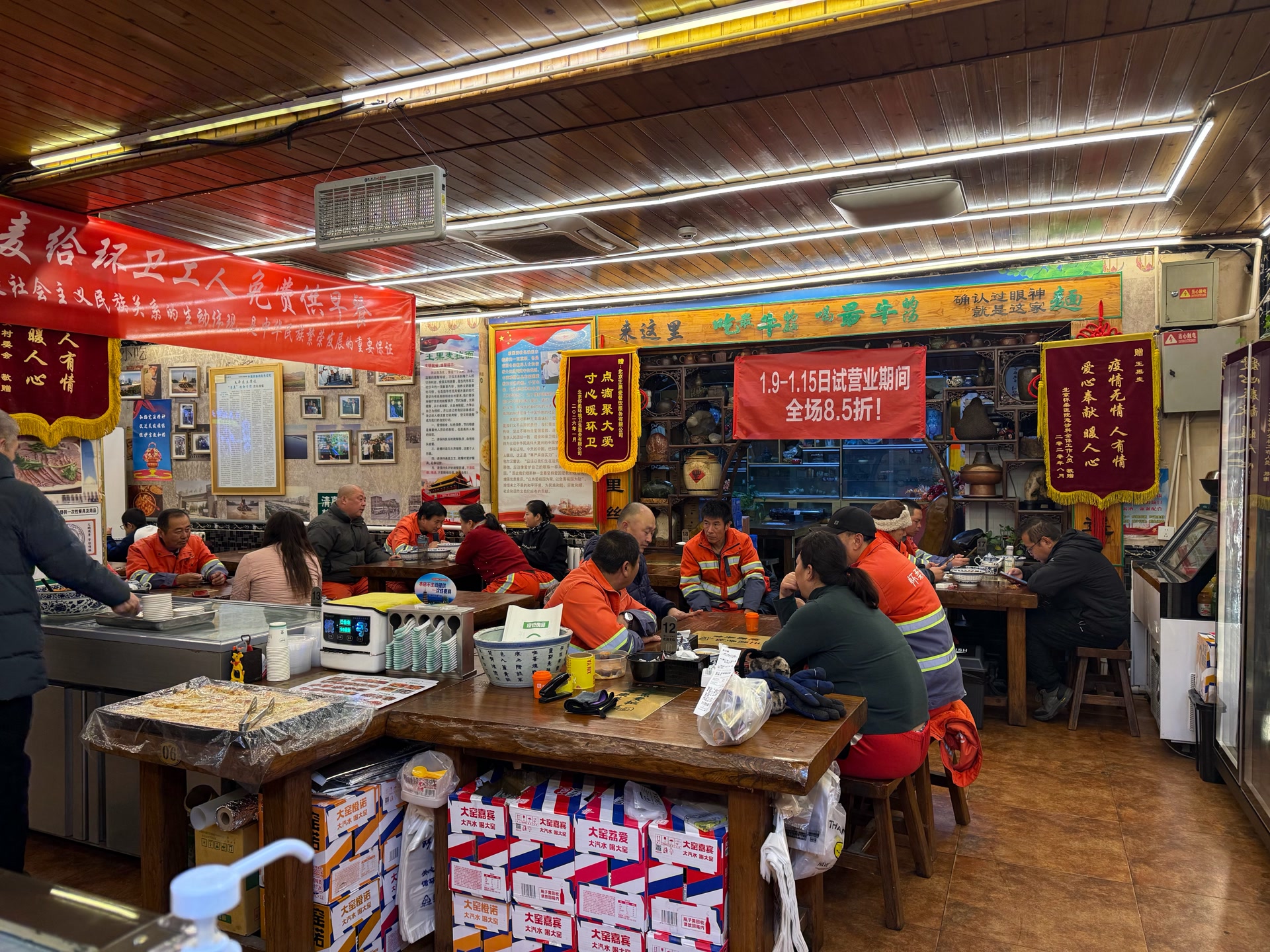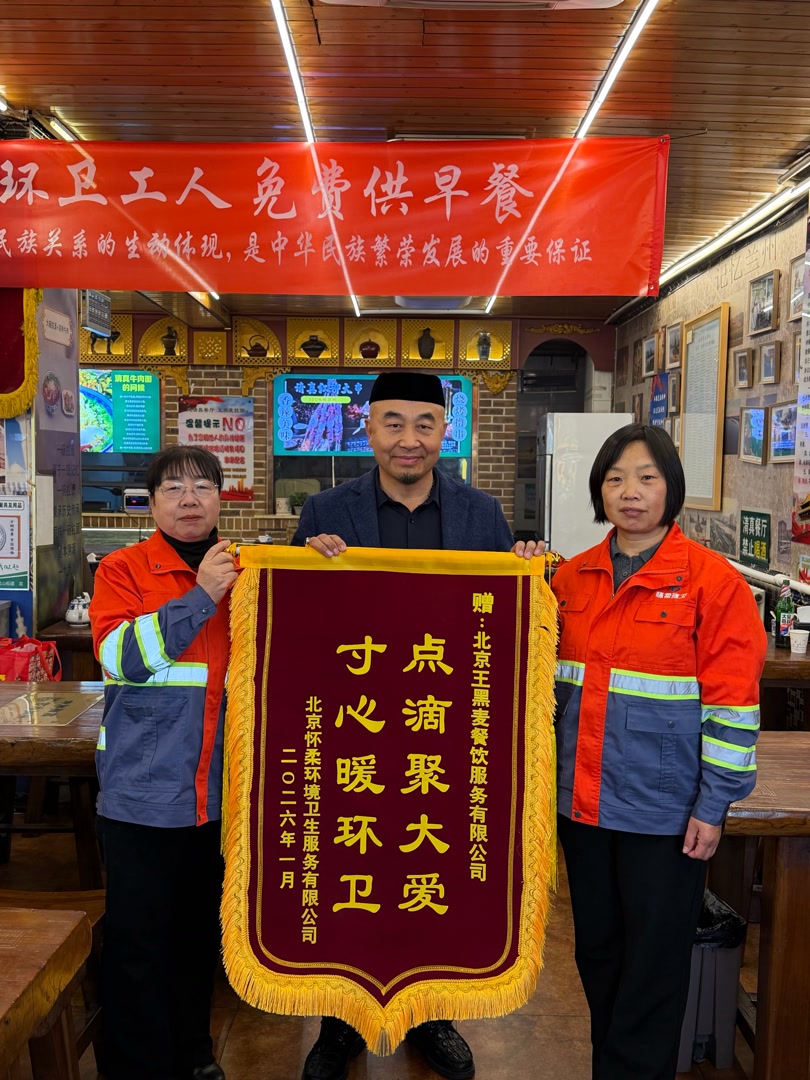 为感谢这份延续6年的暖心善意,怀柔环卫公司特意为面馆送上了一面印着“王黑麦爱心拉面,一碗面温暖一座城”的红色条幅,上面密密麻麻签满了数百名环卫职工的名字。如今,这面承载着满满敬意的条幅就挂在面馆柜台旁,与墙上的5面锦旗相映成辉,为凛冽寒冬添足了人情味与暖意。