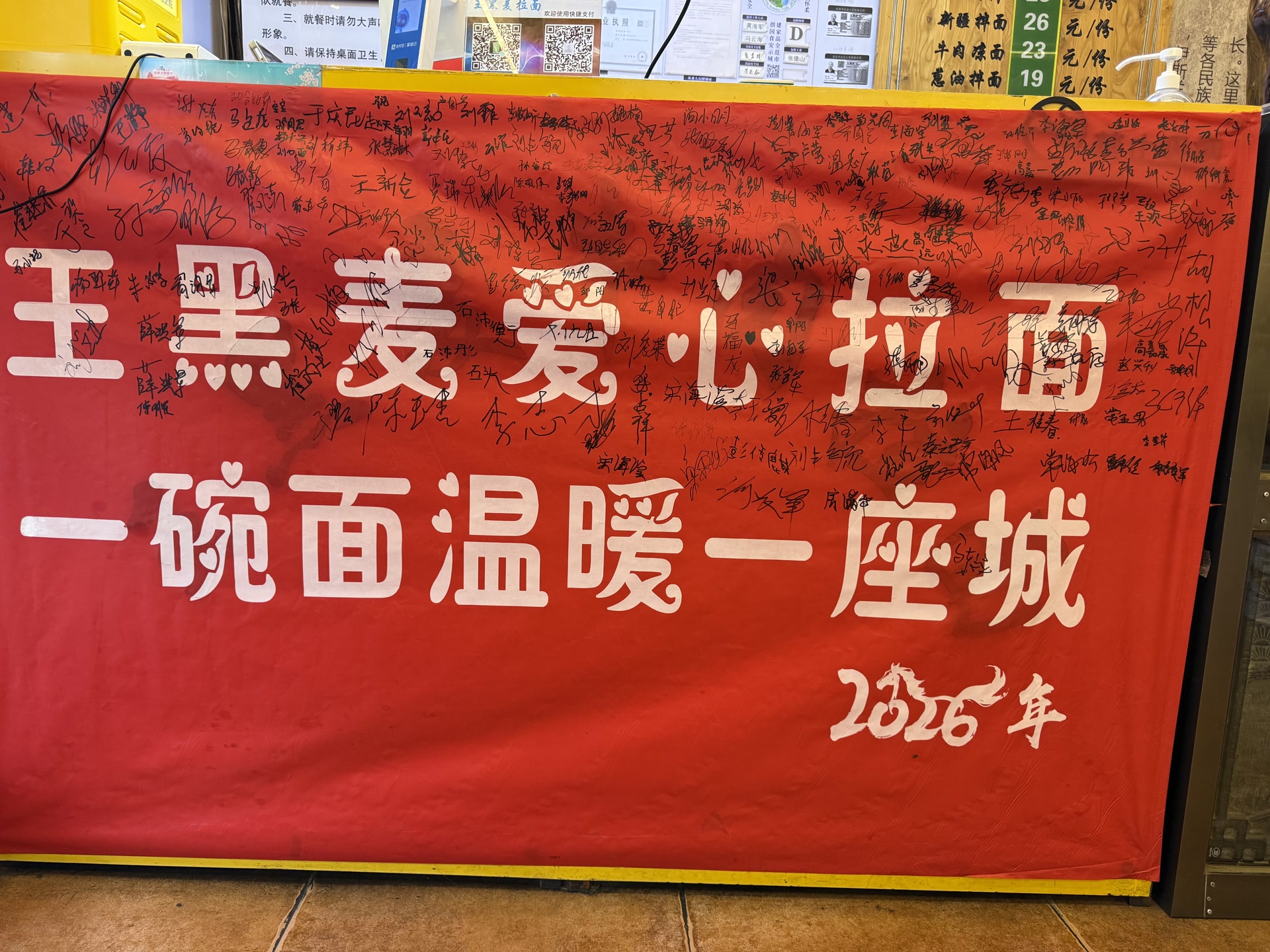 一面写有密密麻麻签名的红色条幅挂在面馆柜台旁。
