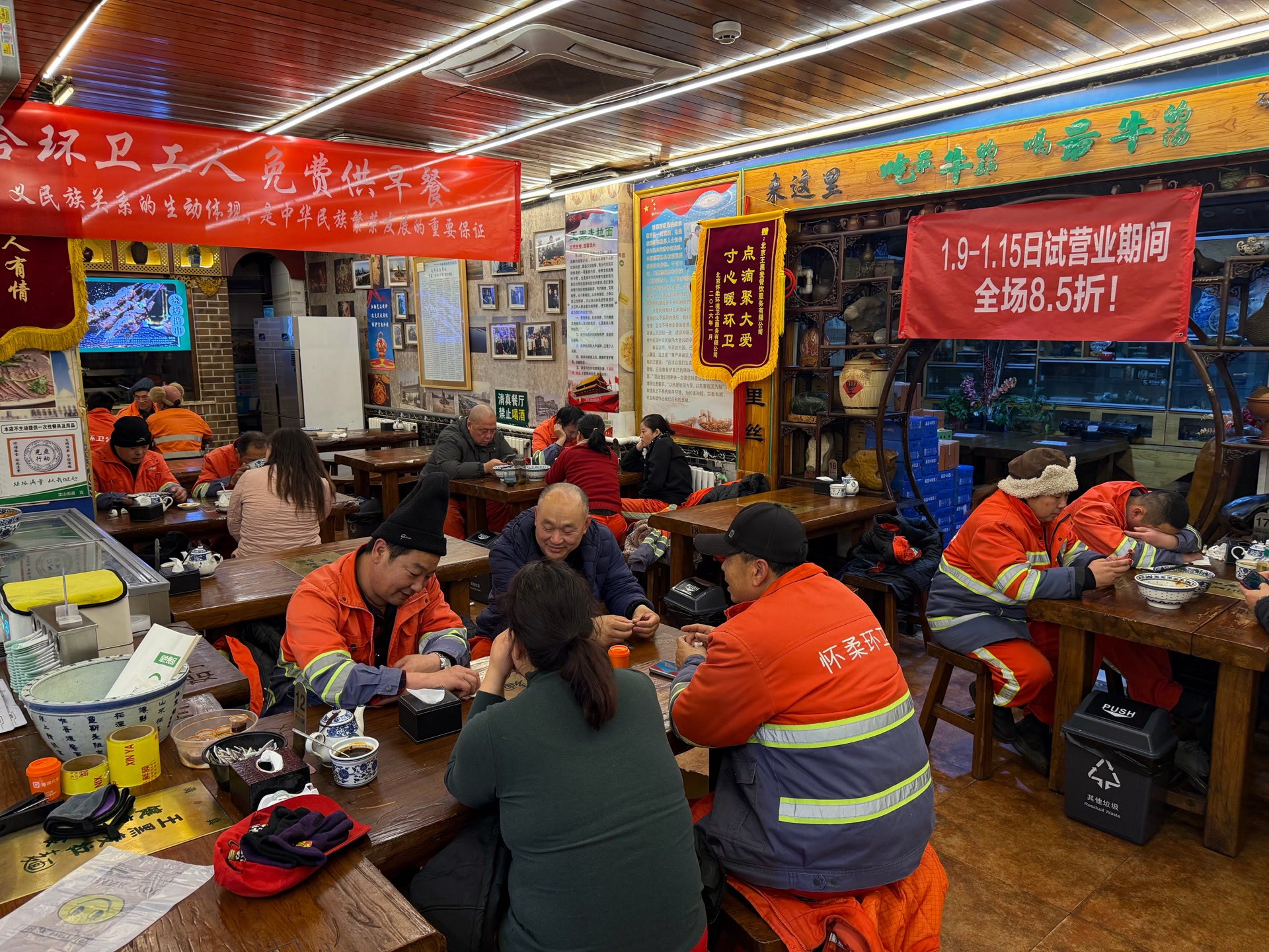 数九寒天的北京,街头寒风刺骨。清晨8时,位于怀柔区东关二区的兰州王黑麦拉面馆里,却一片暖意融融。几十名身穿橙黄色工作服的环卫工人围坐在桌前,吃着一碗碗热气腾腾的牛肉面,萝卜的清甜、牛肉的醇香混着香菜的鲜气,驱散了一身的寒气。