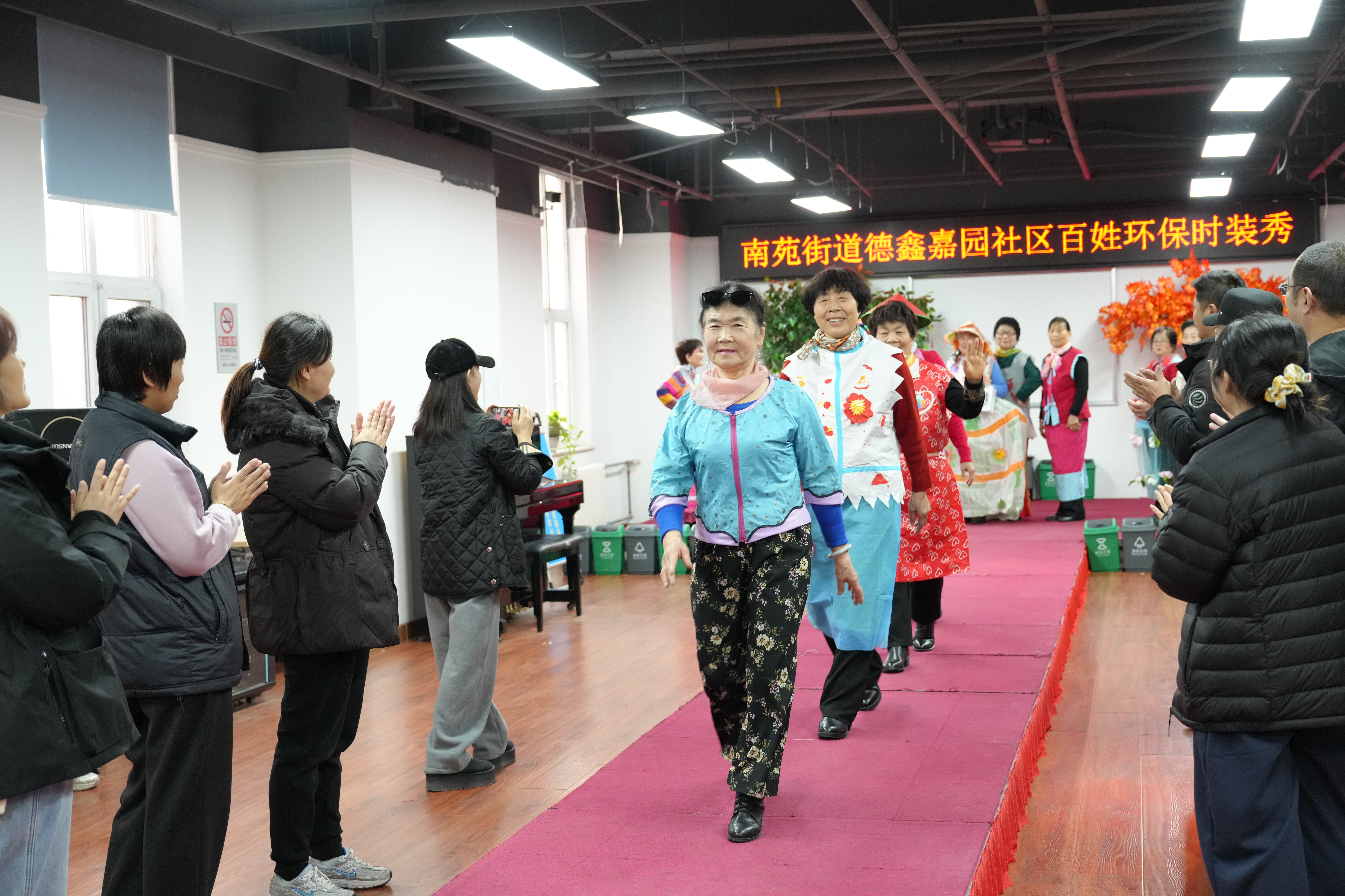 在上个月社区举办的一场环保时装秀上,杜艳芳一亮相,便成了全场的焦点。只见她身着蓝底紫边的精致开衫上衣,黑底白花的裙子裙摆飘逸。