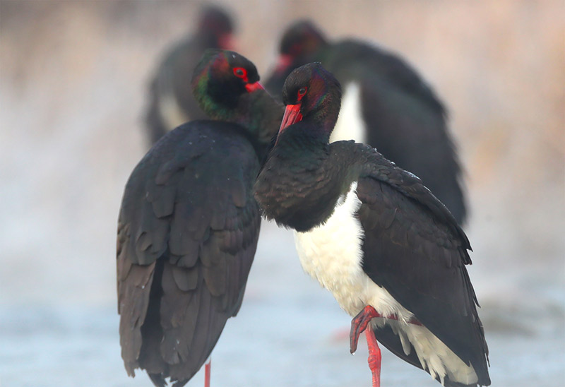 眼下,总共有26只黑鹳在拒马河畔流连,要拍摄到它们并不容易。太阳还没跃出地平线,巡护队员就要藏到掩体中,呼出的气让三脚架和云台上结了冰。天色刚刚亮起来,睡醒的黑鹳就来到河边,不停地梳理羽毛,薄雾笼罩着河流,宛如仙境。