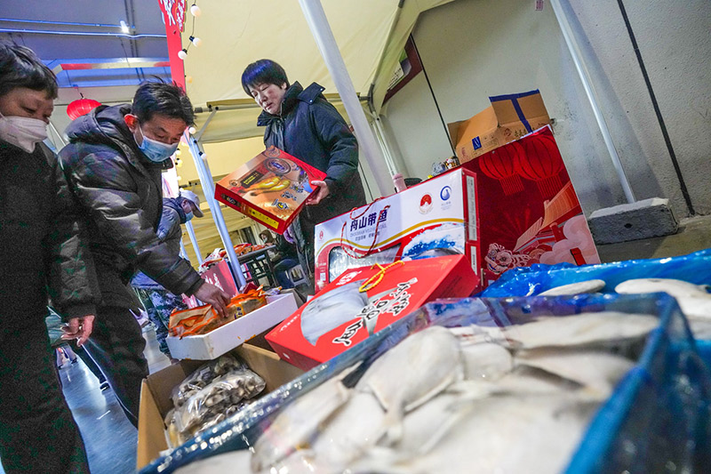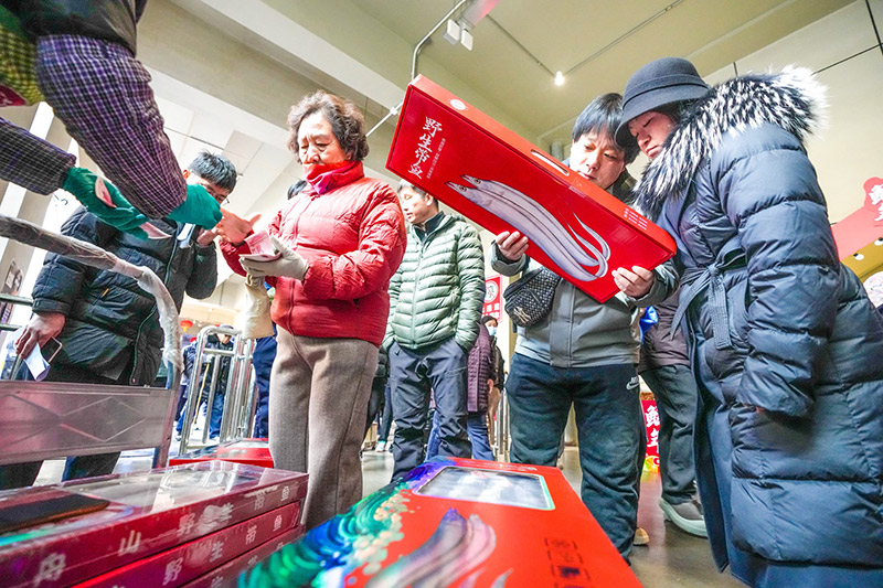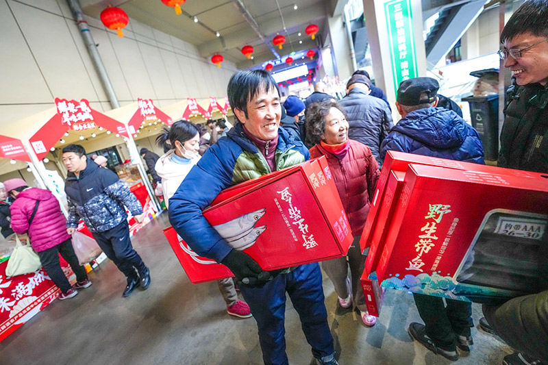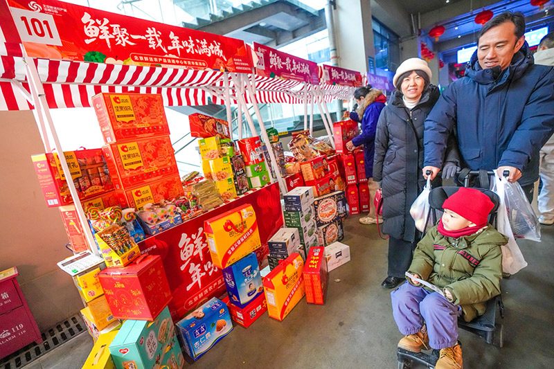 交易大厅二层,一条500米长的步行街上方高高挂起一排排大红灯笼,街两侧,百余家商户的摊位一字排开,米面粮油、调料干货、坚果零食、海鲜水产、肉类冻品,一应俱全。记者在现场看到,市集里人来人往,吆喝声、讲价声此起彼伏——这热闹劲儿,过年的氛围一下子就有了。