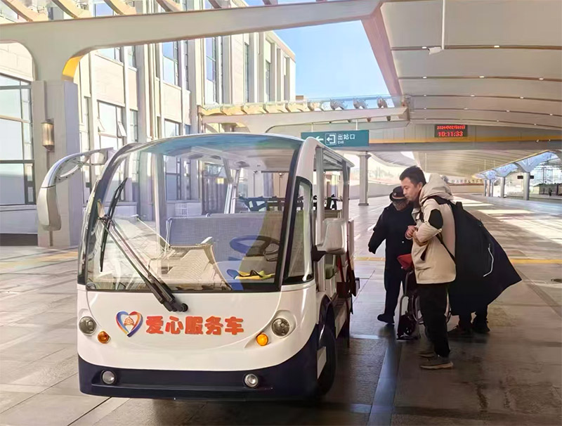 北京站站台上,一辆新投入使用的“爱心电瓶车”将重点旅客送到车厢门口。今年春运,北京站启用电瓶车接送服务。“重点旅客行走不方便,车站台又比较远、走行距离很长,我们可以根据情况提前安排电瓶车,更快、更有效率地接送他们。”一位工作人员表示。