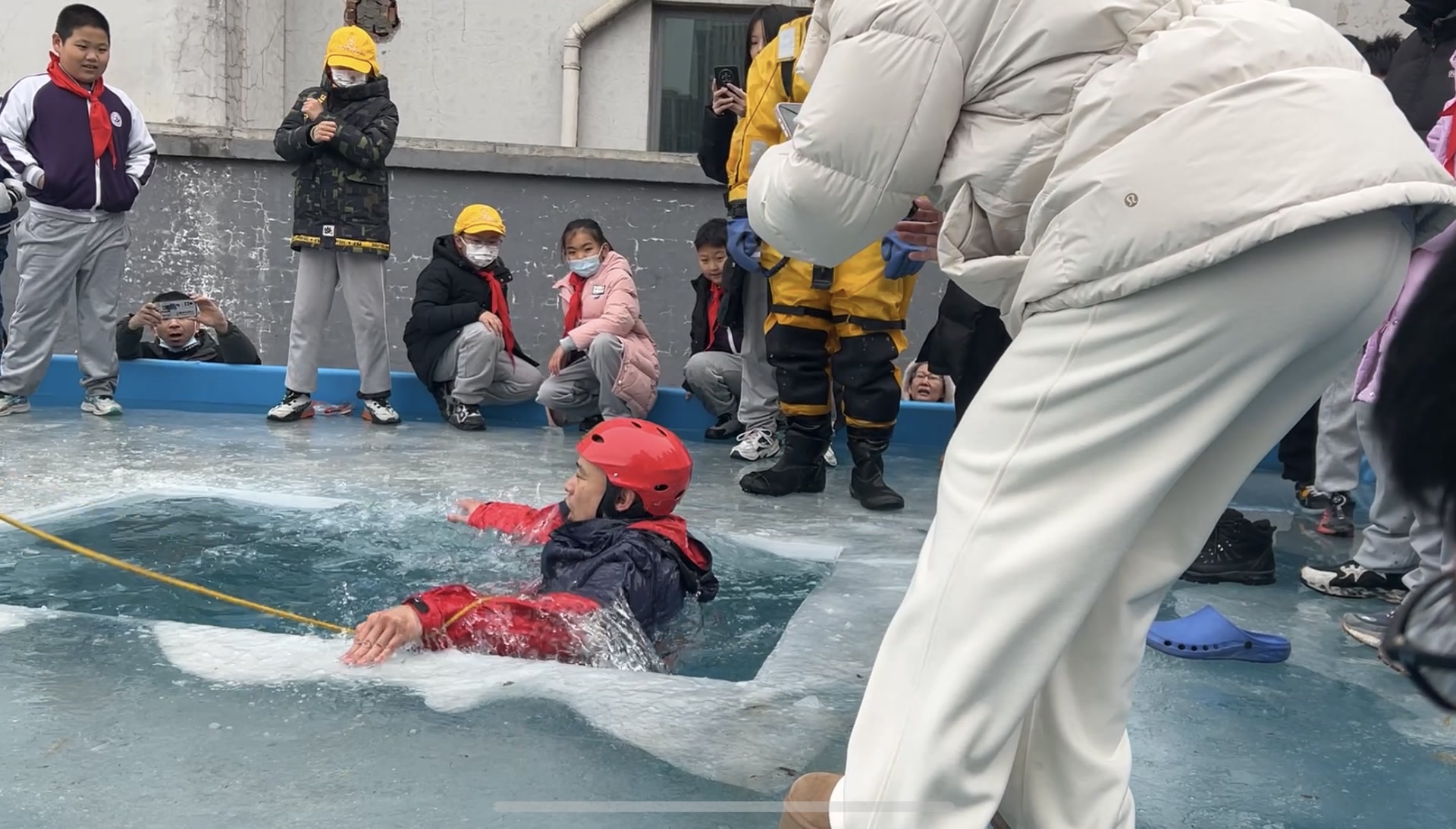 在孩子们问出“羽绒服能当救生衣”的网络传言时,祁兴龙拴好保护绳,穿着羽绒服直接跳入冰水中演示如何自救,引发现场孩子们的一片惊呼,“消防员太厉害了!”
