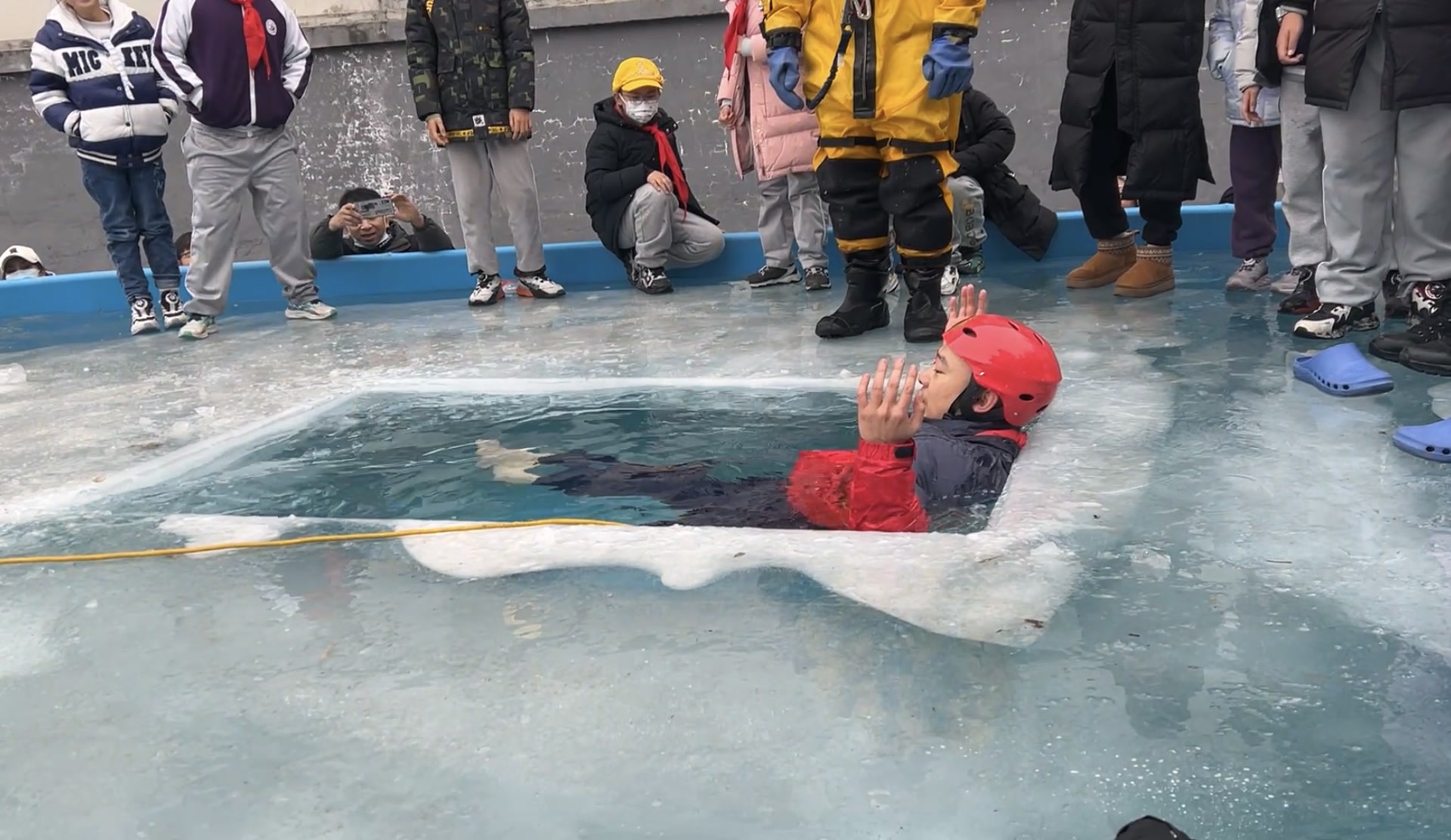 “羽绒服可以在短时间内为落水人员提供一定浮力,但这与羽绒服的充绒量、蓬松度,以及面料的防水性能有很大关系。”祁兴龙刚爬出冰水,顾不上换衣服就赶紧向孩子们讲解道,“普通羽绒服并不能提供长时间的浮力,且落水人员很快会被冻僵,所以不能寄希望于羽绒服,而是从一开始就要远离河湖野冰区域。”
