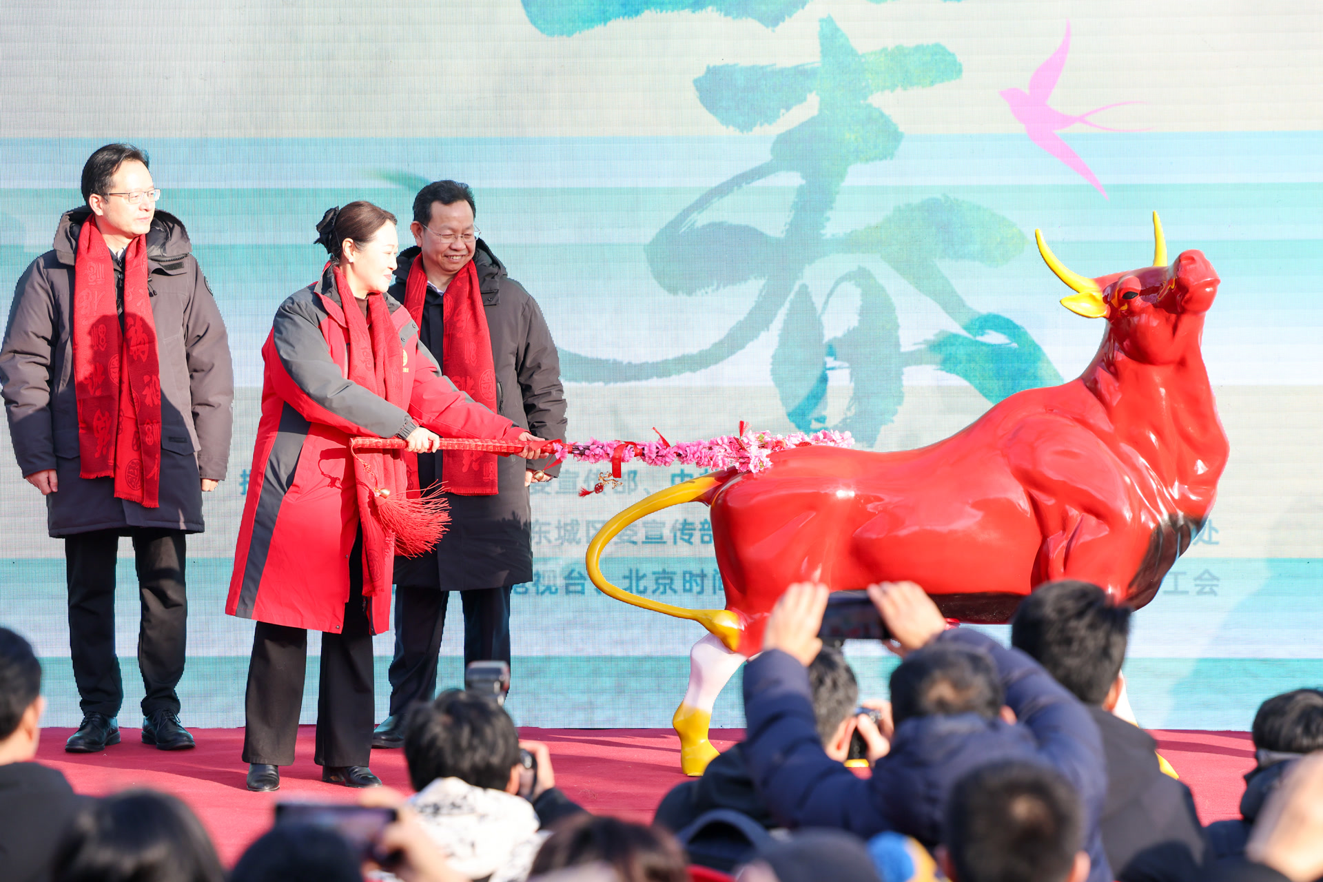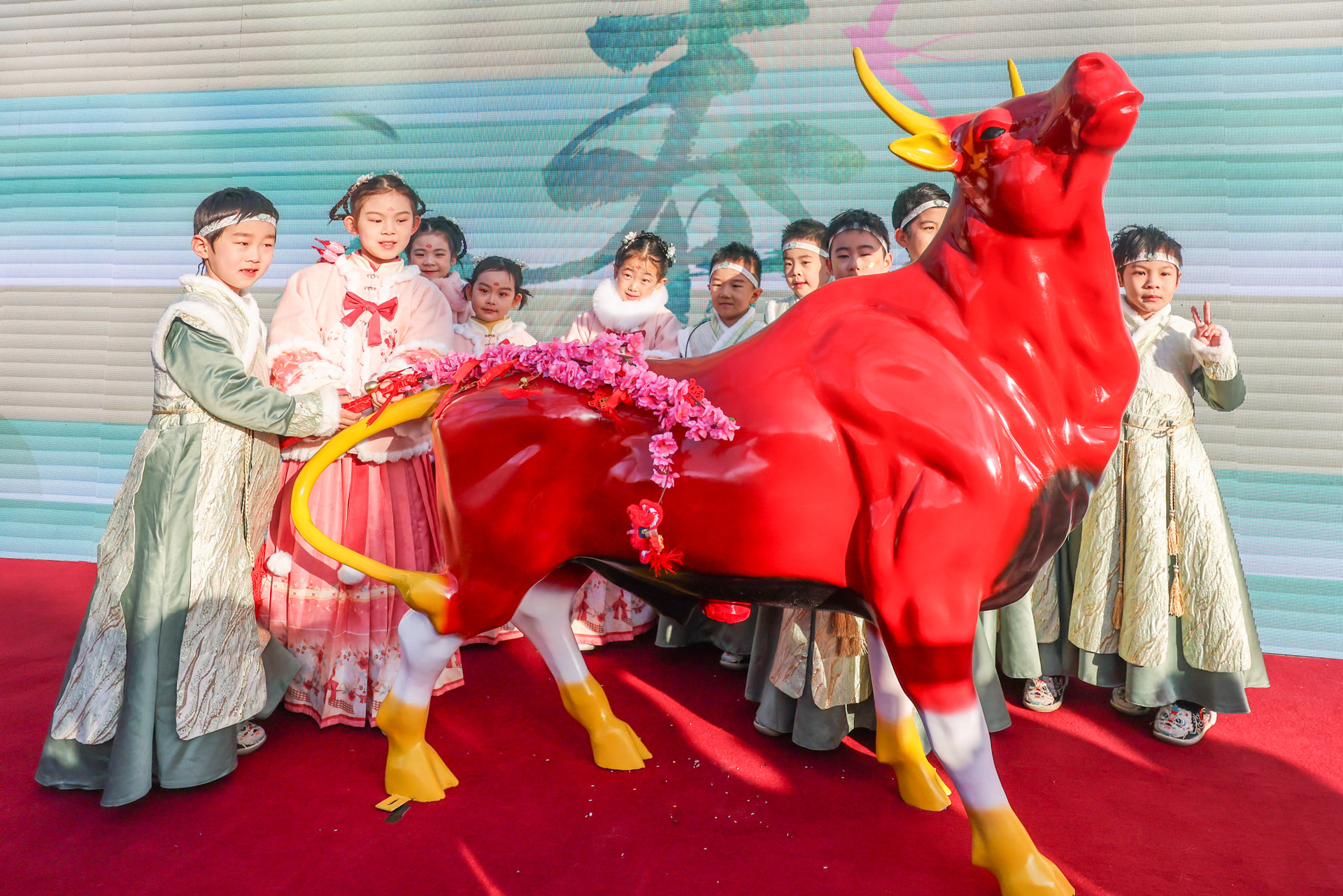 紧接着,悠扬的笛声响起——演奏家孙楚泊带来了表演《扬鞭催马运粮忙》,歌唱家尤泓斐带来《春风十万里》。最受关注的鞭春牛仪式上,嘉宾们为春牛模型点睛、执鞭打牛,寓意催促耕牛、迎接春耕,还将象征吉祥的福包撒向观众,把福气带给人们。