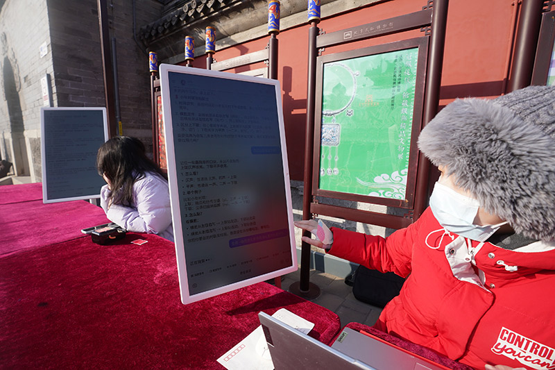 数智共创区现场特设AI智能春联共创区,旨在推动传统文化与当代科技的融合。游客可通过互动端输入“家庭和睦”“事业有成”等个性化心愿关键词,系统将依据古典楹联规律,即时生成寓意吉祥、对仗工整的个性化定制春联。同时,游客还可将生成内容携至传统书写区,由书法老师现场执笔,将“数字文意”落墨于红纸之上,完成从智能生成到墨宝成型的转换。
