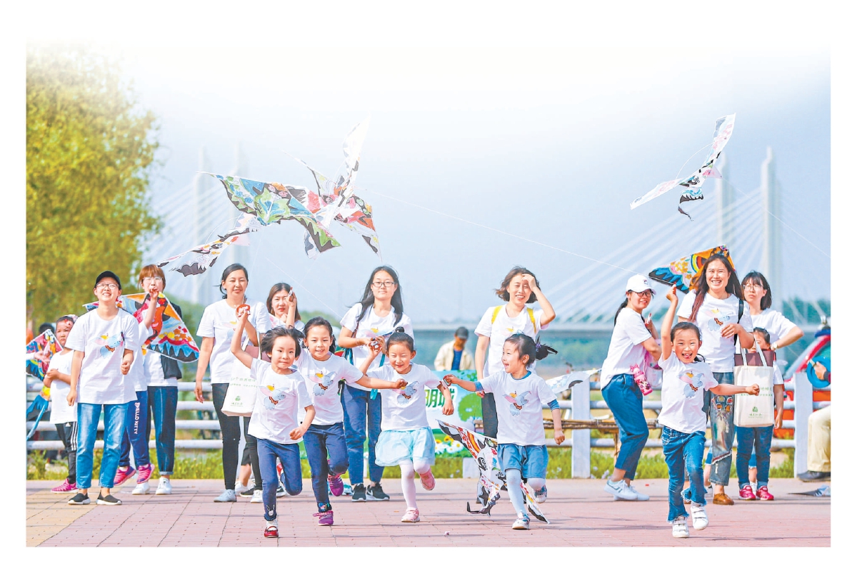 顺义潮白河畔,小朋友放飞风筝,尽情享受美好环境。 北京日报记者 武亦彬摄