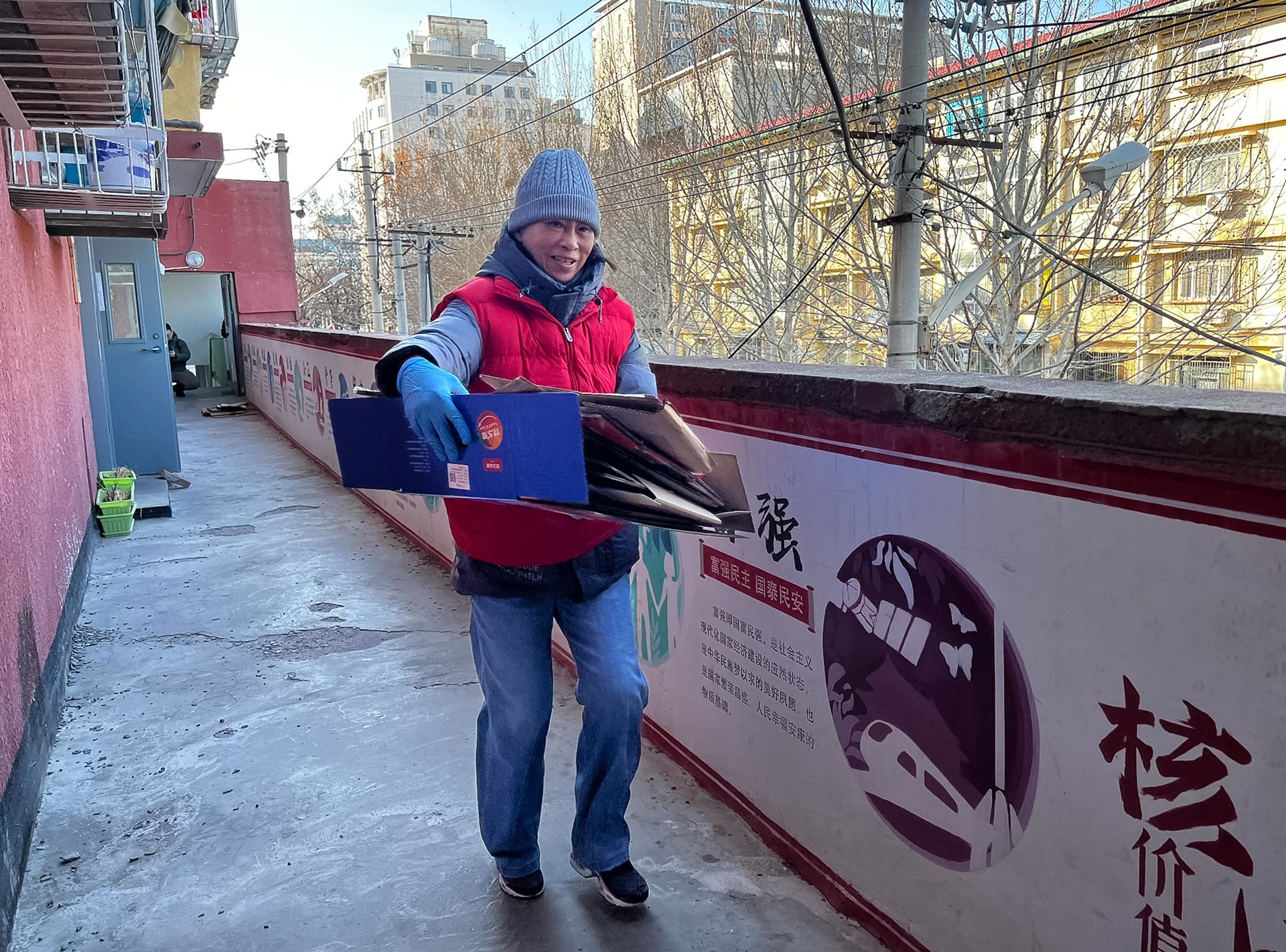 “叔,我搬这摞纸板,您帮忙拎着小折叠桌吧!”上午10点,西城区广内街道核桃园社区格外热闹,不少居民走出家门,和社区志愿者一起对楼道等公共区域进行“卫生大扫除”。