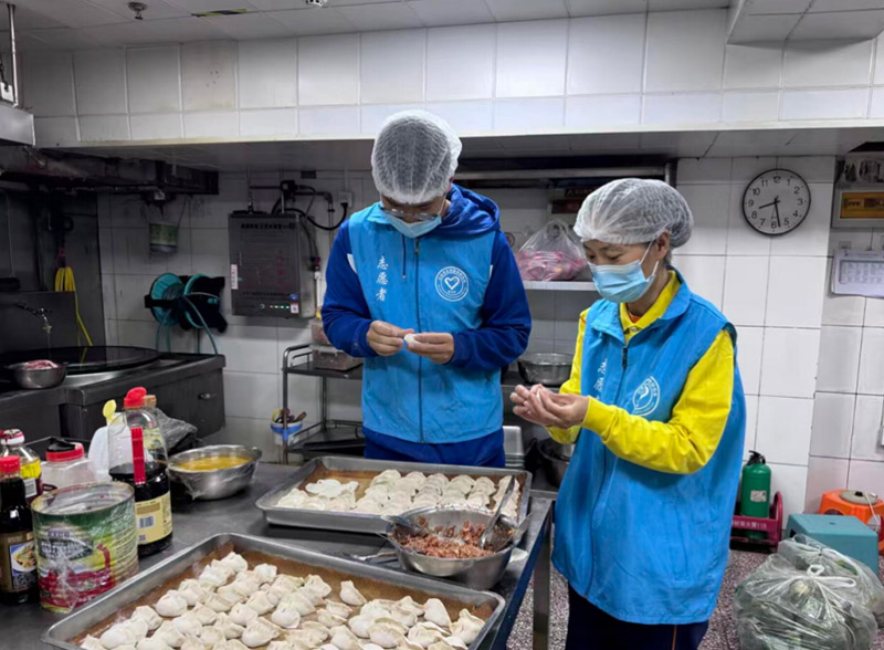 顺义区公共文明引导员在李桥敬老院为老人包饺子。