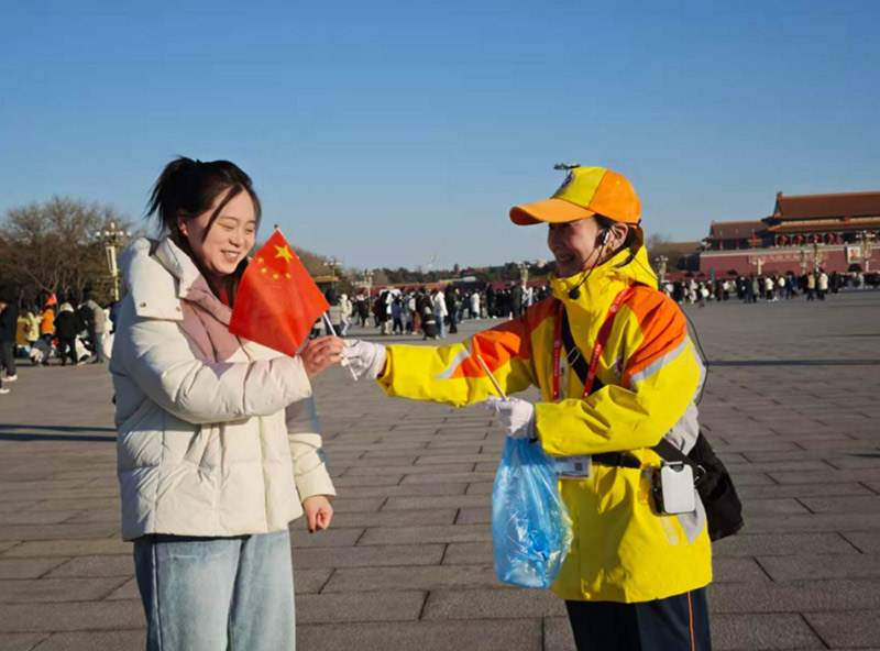 东城区文明引导员在天安门广场开展文明引导服务。
