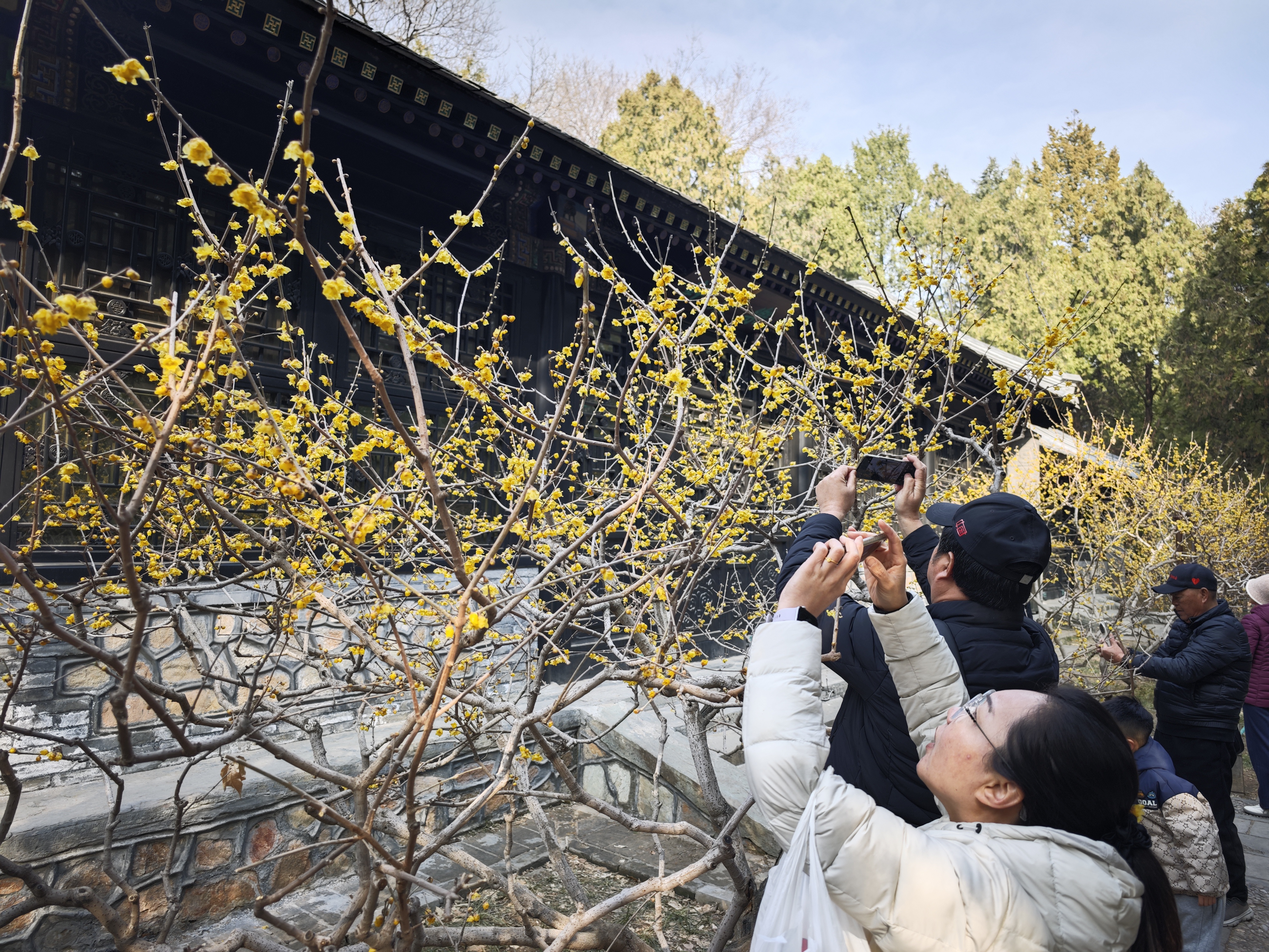 颐和园乐农轩蜡梅盛开,吸引市民前来打卡。