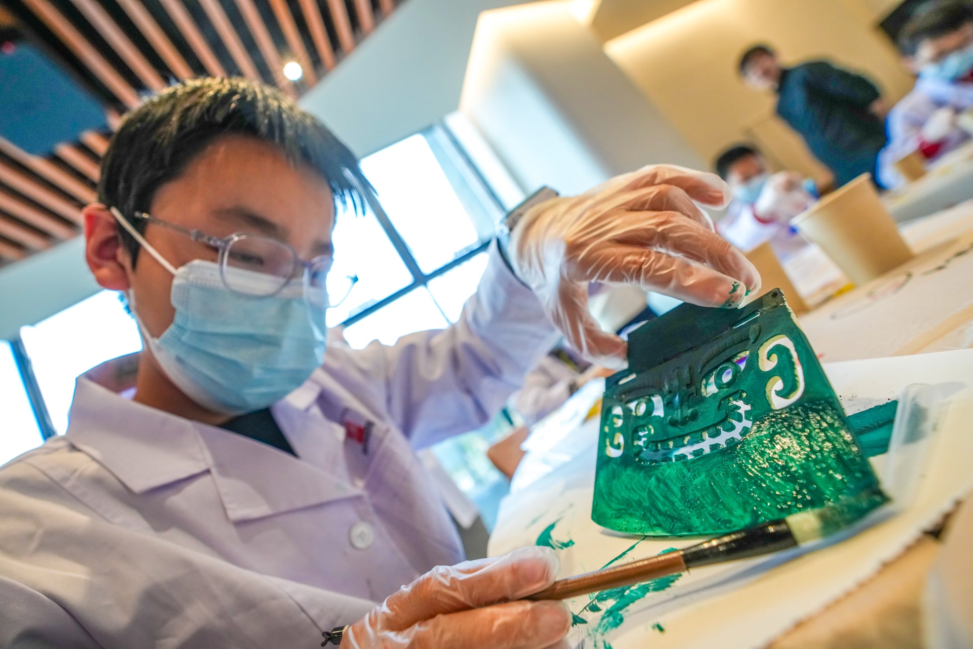 近距离观摩完文物保护中的科技和传统技艺,文保专家又带领大家来到社教培训区,体验“青铜器涂鸦”趣味实践课。在专业指导下,孩子们化身“小小修复师”,用牙刷蘸取虫胶、颜料和沙土,再用小木条拨动牙刷,给青铜器模型上色、做旧,呈现金属锈蚀的颗粒感。“原来青铜器的颜色是这样一层层做出来的!感觉文物在我手中‘活’过来了。”初一学生宫书达举着自己的“作品”兴奋地说,“这项工作需要慢工出细活。我感受到了文化的传承,更体会到文物修复师的匠心精神。”
