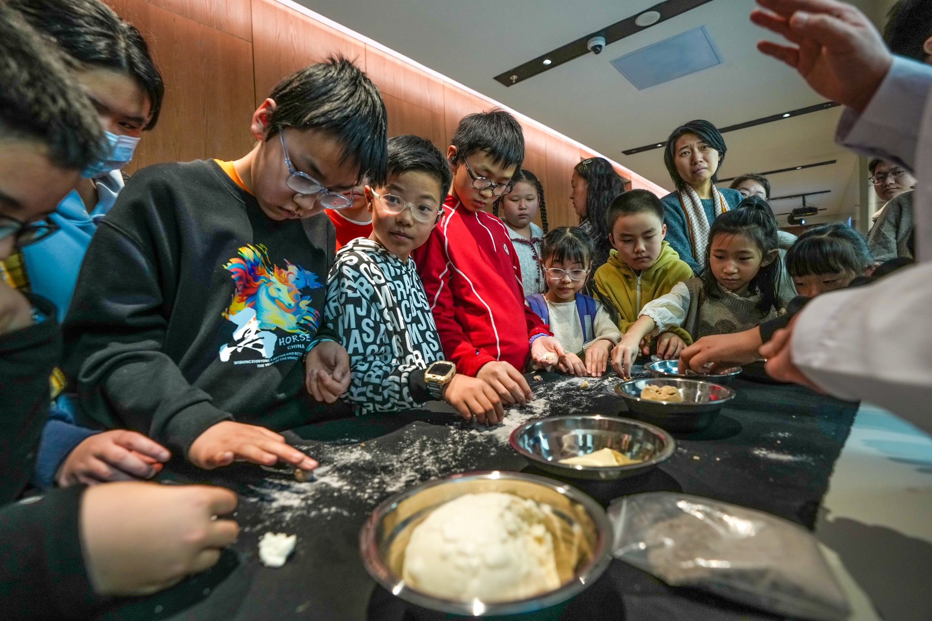 “这些都是生活中常见的主食,是清理书画、丝织品等文物表面灰尘的绝佳材料。”隔壁的有机质文物修复室里,保护部副主任傅萌带着观众体验“面团去尘”技术,她介绍,“用面团将纺织品表面的灰尘去除,看似简单,其实面团的软硬干湿、手指的用力大小都藏着技巧,大家不亲自试试是感受不到的。”