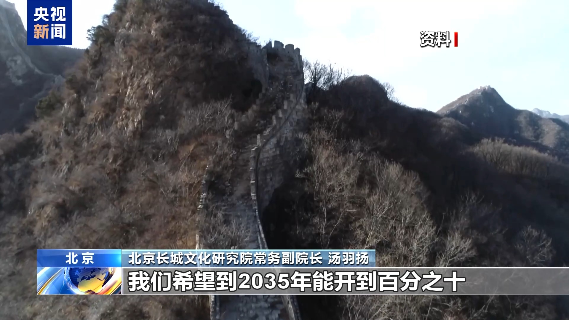北京长城文化研究院常务副院长 汤羽扬:北京长城500多公里。目前开放的有百分之五点几,大概只有二十几公里是作为景区开放的。按照北京整体的长城文化带的规划,我们希望到2035年能开到10%,五十几公里能够开放。