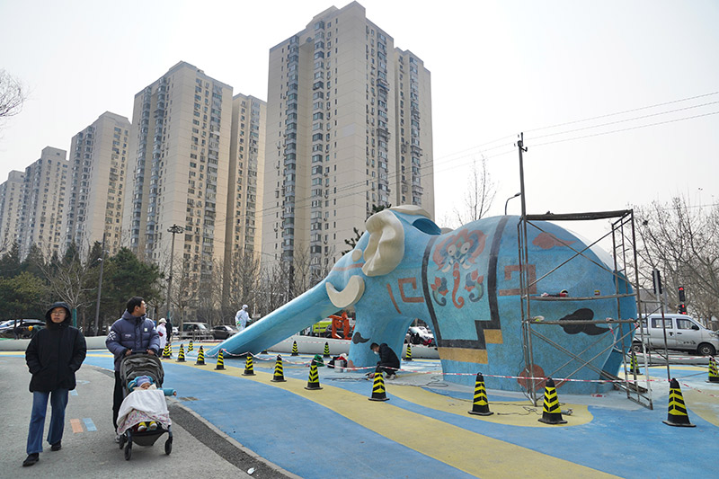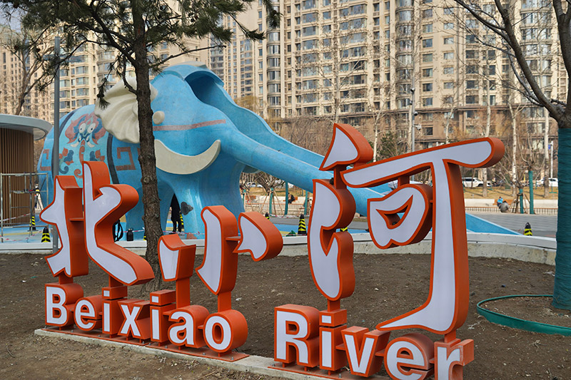 近日,两只充满童趣的大象雕塑滑梯现身北小河畔,一只是素雅灰色的“象屿”,一只是有花纹装饰的蓝色“象林”。