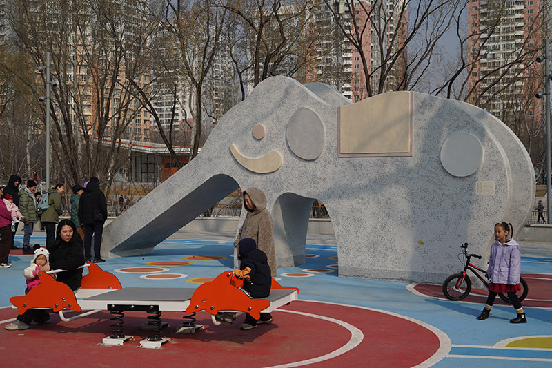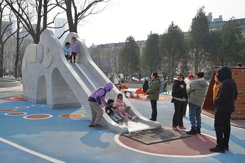 这两座蓝色大象滑梯也是全国首批通体全彩色水磨石大象滑梯,以水磨石为材料,通过三维建模将技术与艺术完美融合,在保证水磨石温润质感的同时,兼顾户外耐用性与使用安全性,让传统材料在现代公共空间焕发新生。